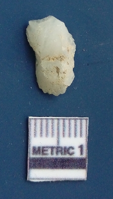 | Description / विवरण | It is a flake. The sides are sharp and retouched. It is white in colour. The striking platform and the bulb of percussion is clearly visible. The flake scars are clearly seen on the dorsal surface while the ventral surface is plain. |