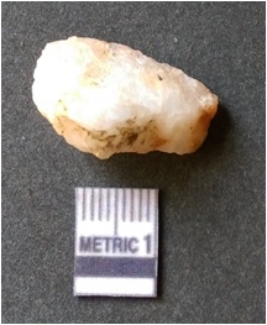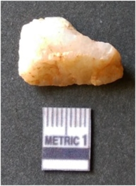 | Description / विवरण | The milky quartz flake has irregular fracture pattern and sharp flaked edges as a result of lithic knapping activity. The piece is pale, with surfacial flake scars and a bulbous end. The flake is white in color. |