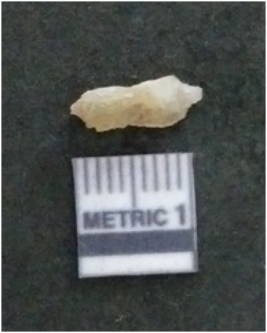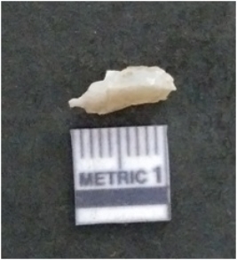 | Description / विवरण | The chalcedony flake is pale in color and translucent in appearance. The piece has s harp flaked ends and a bulbous end due to flaking. The flake has a crypto-crystalline silica matrix. |