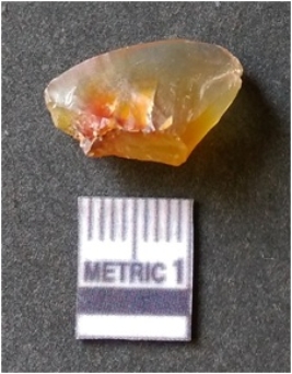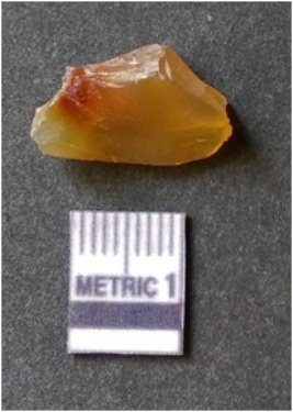 | Description / विवरण | It is chalcedony flake, translucent in appearance. The piece shows sharp pointed ends and flake scars on the surface as a result of flaking. The piece shows a bulb of percussion. |