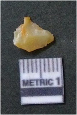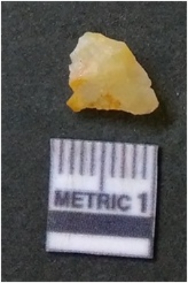 | Description / विवरण | It is chalcedony flake, translucent in appearance. The piece shows sharp pointed ends and flake scars on the surface as a result of flaking. The piece shows a bulb of percussion. |