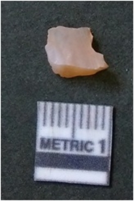 | Description / विवरण | The flake has irregular fracture pattern and sharp flaked edges as a result of lithic knapping activity. The piece is pale, with surfacial flake scars and a bulbous end. The quartz flake is rosy white in colour. |