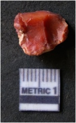 | Description / विवरण | It is carnelian flake red in color, with sharp flakes edges and a small bulb of percussion owing to knapping activity. The piece has sharp flaked edges and a crypto-crystalline matrix. |