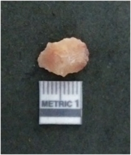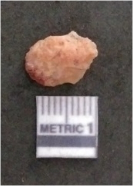 | Description / विवरण | The chalcedony flake is pale in color and translucent in appearance. The piece has s harp flaked ends and a bulbous end due to flaking. The flake has a crypto-crystalline silica matrix. |