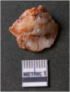| Description / विवरण | The quartz flake has sharp flaked edges and pointed ends as a result of flaking. The piece is semi-transparent in nature with irregular fracture pattern. The piece is roughly triangular in shape and has a prominent bulb of percussion. |