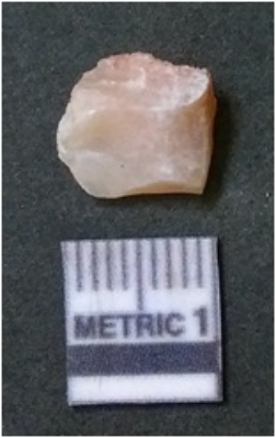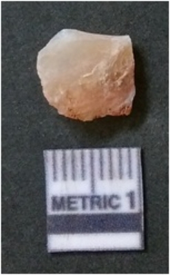 | Description / विवरण | The flake has irregular fracture pattern and sharp flaked edges as a result of lithic knapping activity. The piece is pale, with surfacial flake scars and a bulbous end. The quartz flake is rosy white in colour. |