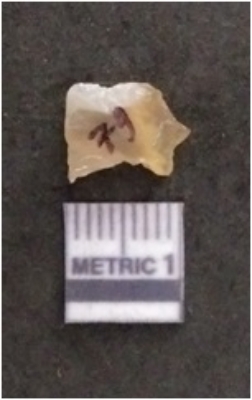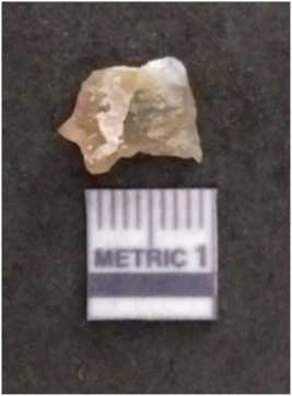 | Description / विवरण | The chalcedony flake is pale in color and translucent in appearance. The piece has s harp flaked ends and a bulbous end due to flaking. The flake has a crypto-crystalline silica matrix. |