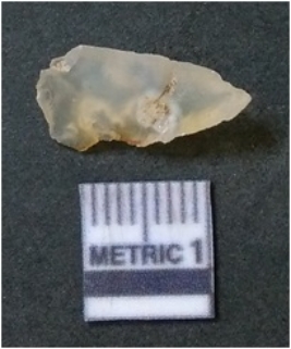 | Description / विवरण | The quartz flake is pointed, with a pointed end and another rounded end. The piece has flake scars on the surface and sharp edges due to flaking. |