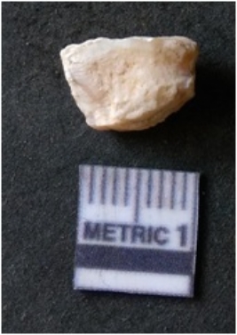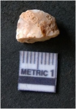 | Description / विवरण | The quartz flake has sharp flaked edges and pointed ends as a result of flaking. The piece is semi-transparent in nature with irregular fracture pattern. The piece is roughly triangular in shape and has a prominent bulb of percussion. |