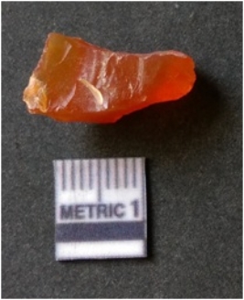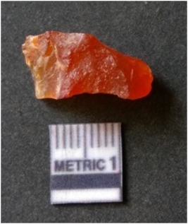 | Description / विवरण | It is carnelian flake red in color, with sharp flakes edges and a small bulb of percussion owing to knapping activity. The piece has sharp flaked edges and a crypto-crystalline matrix. |