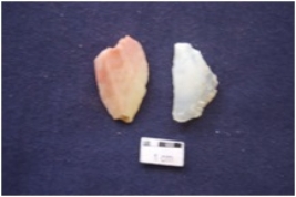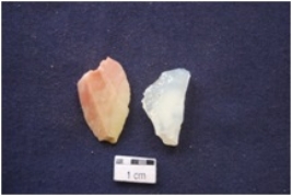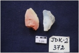 | Description / विवरण | Core with bladescars on Chert, prepared platform along one end. One flake on chalcedony, byproduct of stone tool manufacturing. |