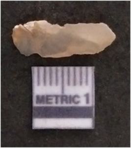 | Description / विवरण | The chalcedony flake is pale in color and translucent in appearance. The piece has s harp flaked ends and a bulbous end due to flaking. The flake has a crypto-crystalline silica matrix. |