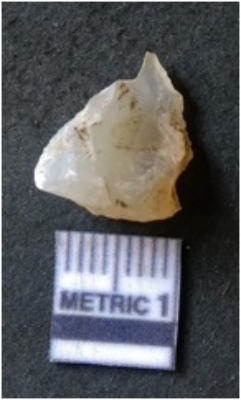 | Description / विवरण | The banded agate piece is crystalline in nature, with a smooth fracture pattern and visible bands on the flaked sides. The piece is pale in color and has sharp flaked ends. |