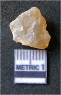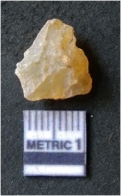 | Description / विवरण | It is chalcedony flake, translucent in appearance. The piece shows sharp pointed ends and flake scars on the surface as a result of flaking. The piece shows a bulb of percussion. |