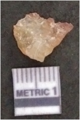 | Description / विवरण | The chalcedony flake is pale in color and translucent in appearance. The piece has s harp flaked ends and a bulbous end due to flaking. The flake has a crypto-crystalline silica matrix. |
