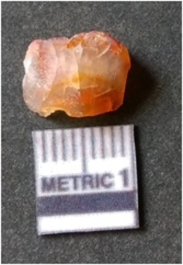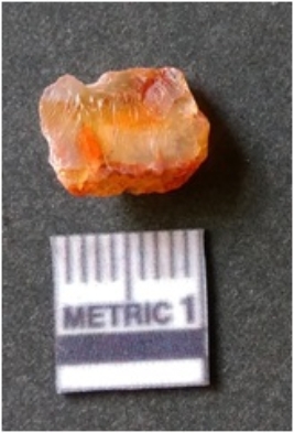 | Description / विवरण | It is chalcedony flake, translucent in appearance. The piece shows sharp pointed ends and flake scars on the surface as a result of flaking. The piece shows a bulb of percussion. |