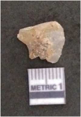 | Description / विवरण | The chalcedony flake is pale in color and translucent in appearance. The piece has s harp flaked ends and a bulbous end due to flaking. The flake has a crypto-crystalline silica matrix. |