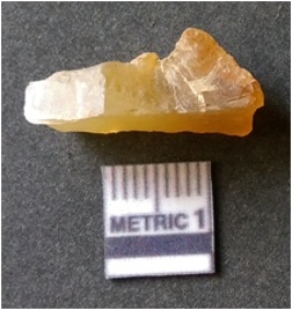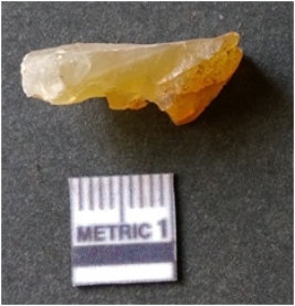 | Description / विवरण | It is chalcedony flake, translucent in appearance. The piece shows sharp pointed ends and flake scars on the surface as a result of flaking. The piece shows a bulb of percussion. |