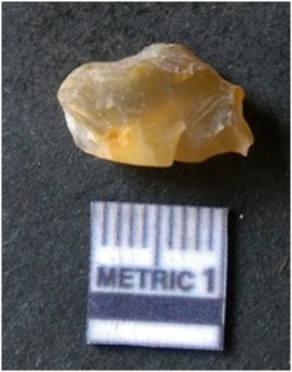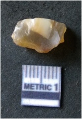 | Description / विवरण | It is chalcedony flake, translucent in appearance. The piece shows sharp pointed ends and flake scars on the surface as a result of flaking. The piece shows a bulb of percussion. |