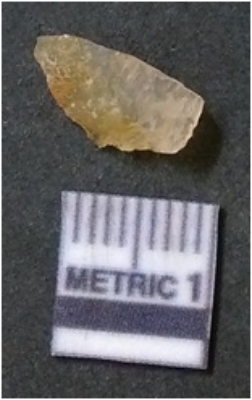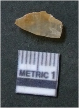 | Description / विवरण | The quartz flake has sharp flaked edges and pointed ends as a result of flaking. The piece is semi-transparent in nature with irregular fracture pattern. The piece is roughly triangular in shape and has a prominent bulb of percussion. |