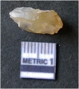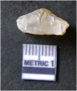 | Description / विवरण | It is chalcedony flake, translucent in appearance. The piece shows sharp pointed ends and flake scars on the surface as a result of flaking. The piece shows a bulb of percussion. |