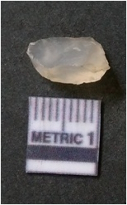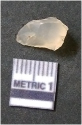 | Description / विवरण | The quartz flake has sharp flaked edges and pointed ends as a result of flaking. The piece is semi-transparent in nature with irregular fracture pattern. The piece is roughly triangular in shape and has a prominent bulb of percussion. |