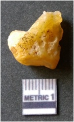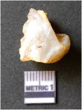 | Description / विवरण | The quartz flake has sharp flaked edges and pointed ends as a result of flaking. The piece is semi-transparent in nature with irregular fracture pattern. The piece is roughly triangular in shape and has a prominent bulb of percussion. |