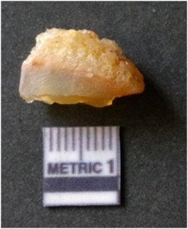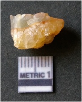| Description / विवरण | It is chalcedony flake, translucent in appearance. The piece shows sharp pointed ends and flake scars on the surface as a result of flaking. The piece shows a bulb of percussion. |