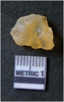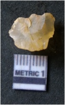 | Description / विवरण | It is chalcedony flake, translucent in appearance. The piece shows sharp pointed ends and flake scars on the surface as a result of flaking. The piece shows a bulb of percussion. |