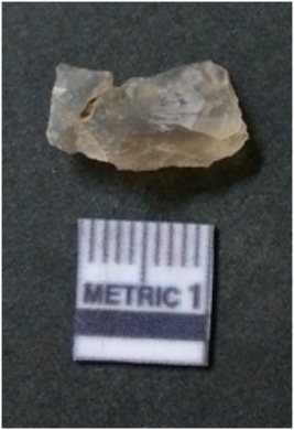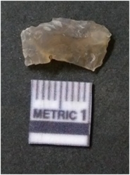 | Description / विवरण | The flake has irregular fracture pattern and sharp flaked edges as a result of lithic knapping activity. The piece is pale, with surfacial flake scars and a bulbous end. The flake is of smoky quartz variety, grayish in colour and translucent in appearance. |