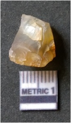 | Description / विवरण | It is chalcedony flake, translucent in appearance. The piece shows sharp pointed ends and flake scars on the surface as a result of flaking. The piece shows a bulb of percussion. |