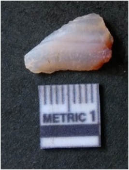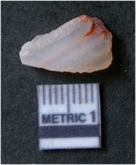 | Description / विवरण | It is chalcedony flake, translucent in appearance. The piece shows sharp pointed ends and flake scars on the surface as a result of flaking. The piece shows a bulb of percussion. |