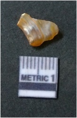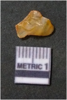| Description / विवरण | It is chalcedony flake, translucent in appearance. The piece shows sharp pointed ends and flake scars on the surface as a result of flaking. The piece shows a bulb of percussion. |