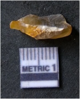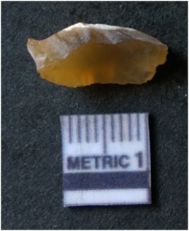 | Description / विवरण | The agate piece is translucent in appurtenance, with angular flaked edges and a bulb of percussion. The piece shows flake scars on the surface. |