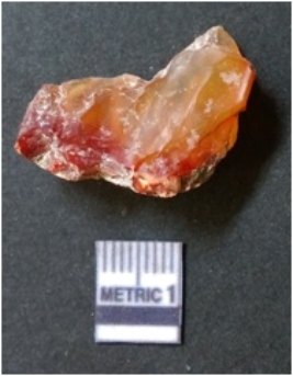 | Description / विवरण | It is carnelian flake red in color, with sharp flakes edges and a small bulb of percussion owing to knapping activity. The piece has sharp flaked edges and a crypto-crystalline matrix. |