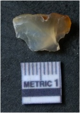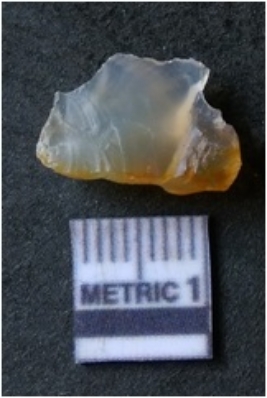 | Description / विवरण | It is chalcedony flake, translucent in appearance. The piece shows sharp pointed ends and flake scars on the surface as a result of flaking. The piece shows a bulb of percussion. |