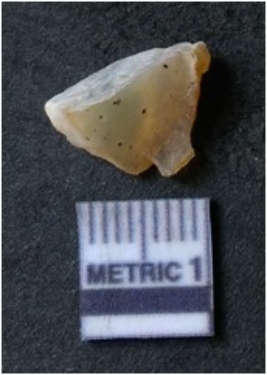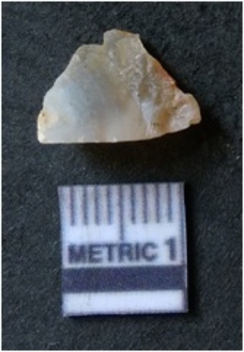 | Description / विवरण | The chert piece is dark in color, with a prominent bulb of percussion and sharp flaked edges. The piece is a part of lithic debitage or raw material for lithic knapping. The piece shows clear ripple marks and bulb of percussion. |