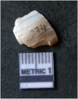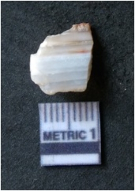 | Description / विवरण | The banded agate piece is crystalline in nature, with a smooth fracture pattern and visible bands on the flaked sides. The piece is pale in color and has sharp flaked ends. |