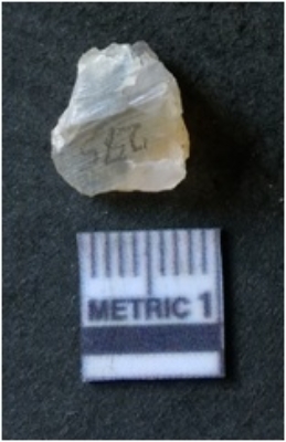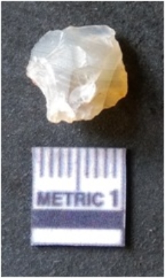 | Description / विवरण | It is chalcedony flake, translucent in appearance. The piece shows sharp pointed ends and flake scars on the surface as a result of flaking. The piece shows a bulb of percussion. |