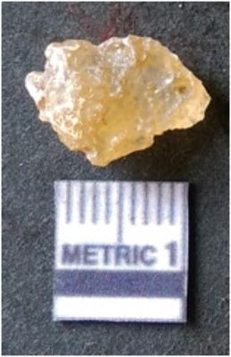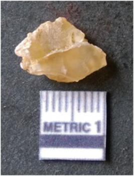| Description / विवरण | The quartz flake has sharp flaked edges and pointed ends as a result of flaking. The piece is semi-transparent in nature with irregular fracture pattern. The piece is roughly triangular in shape and has a prominent bulb of percussion. |