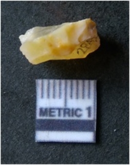 | Description / विवरण | The quartz flake has sharp flaked edges and pointed ends as a result of flaking. The piece is semi-transparent in nature with irregular fracture pattern. The piece is roughly triangular in shape and has a prominent bulb of percussion. |