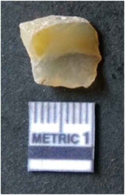| Description / विवरण | The jasper fragment has sharp flaked edges and a bulb of percussion. The piece is dark in color and has crypto crystalline matrix. Flake scars are visible on the surface and bulb of percussion is present as a result of lithic knapping activity. |