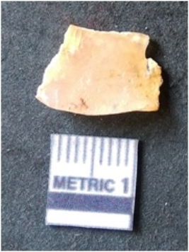 | Description / विवरण | The jasper fragment has sharp flaked edges and a bulb of percussion. The piece is dark in color and has crypto crystalline matrix. Flake scars are visible on the surface and bulb of percussion is present as a result of lithic knapping activity. |