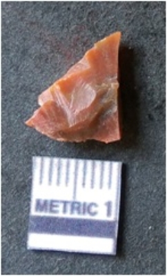 | Description / विवरण | The agate flake is flat with clearly visible bands and sharp flaked edges. The flake is dark in color with whitish bands and a small bulb of percussion. |