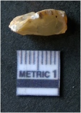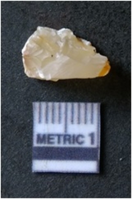 | Description / विवरण | The flake is flat crypto crystalline in nature and has sharp flaked edges. The piece has a silicones matrix and flake scars on the surface due to flaking. |