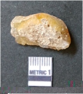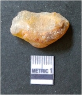 | Description / विवरण | The quartz flake has sharp flaked edges and pointed ends as a result of flaking. The piece is semi-transparent in nature with irregular fracture pattern. The piece is roughly triangular in shape and has a prominent bulb of percussion. |
