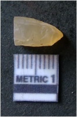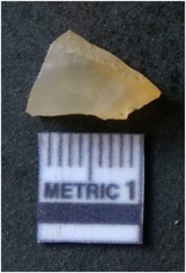 | Description / विवरण | The flake is flat crypto crystalline in nature and has sharp flaked edges. The piece has a silicones matrix and flake scars on the surface due to flaking. |