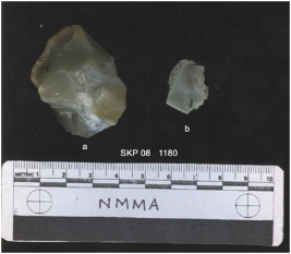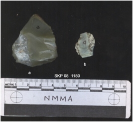 | Description / विवरण | Lithic debitage in chert. It is green in color. The ridges can be seen. |