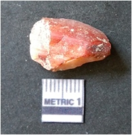 | Description / विवरण | The flake has irregular fracture pattern and sharp flaked edges as a result of lithic knapping activity. The piece is pale, with surfacial flake scars and a bulbous end. The quartz flake is rosy white in colour. |