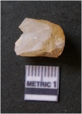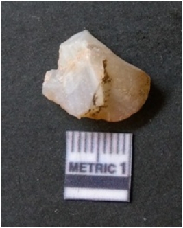 | Description / विवरण | It is chalcedony flake, translucent in appearance. The piece shows sharp pointed ends and flake scars on the surface as a result of flaking. The piece shows a bulb of percussion. |